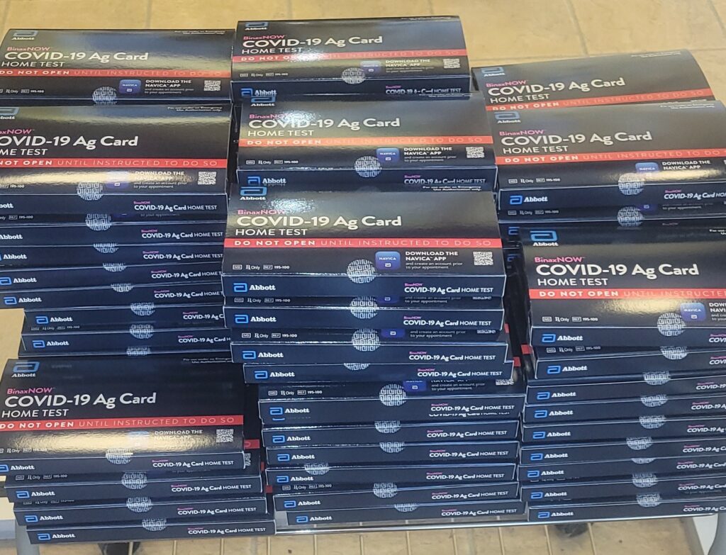 We currently have test kits in the lobby entryway. There is a limit of 4 test kits per household.